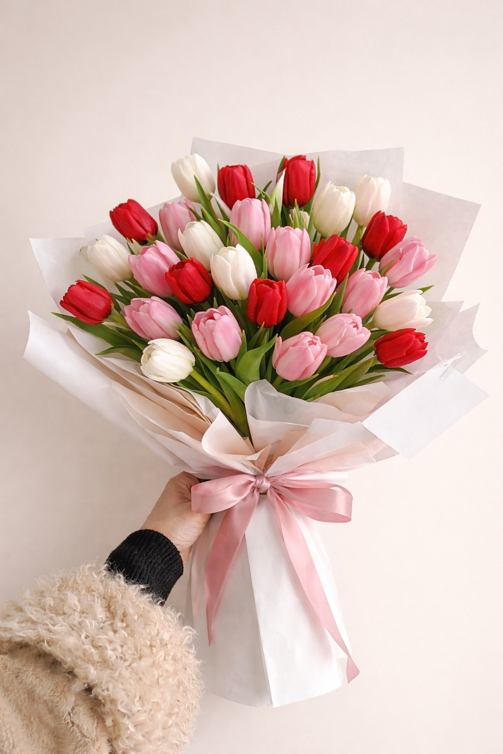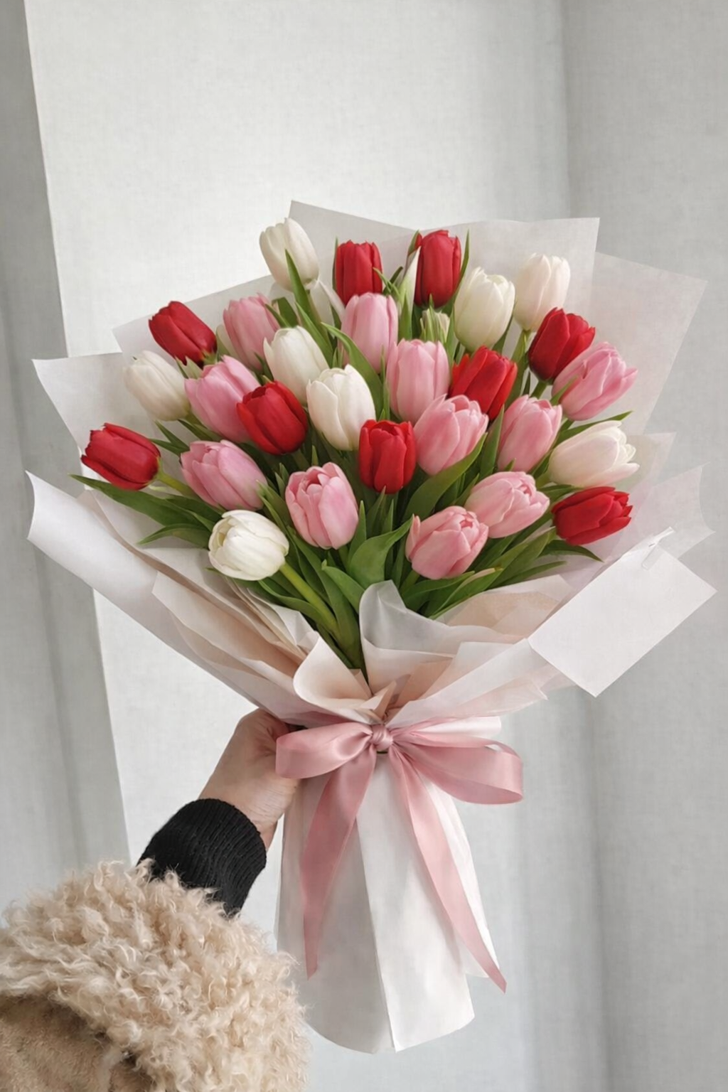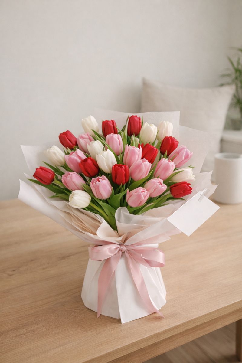 A Valentine’s Day bouquet of 24 fresh tulips in soft shades of red, pink, and white, thoughtfully arranged in a romantic asymmetrical design. Wrapped in elegant white paper and finished with a delicate pink ribbon, this bouquet is a timeless expression of love