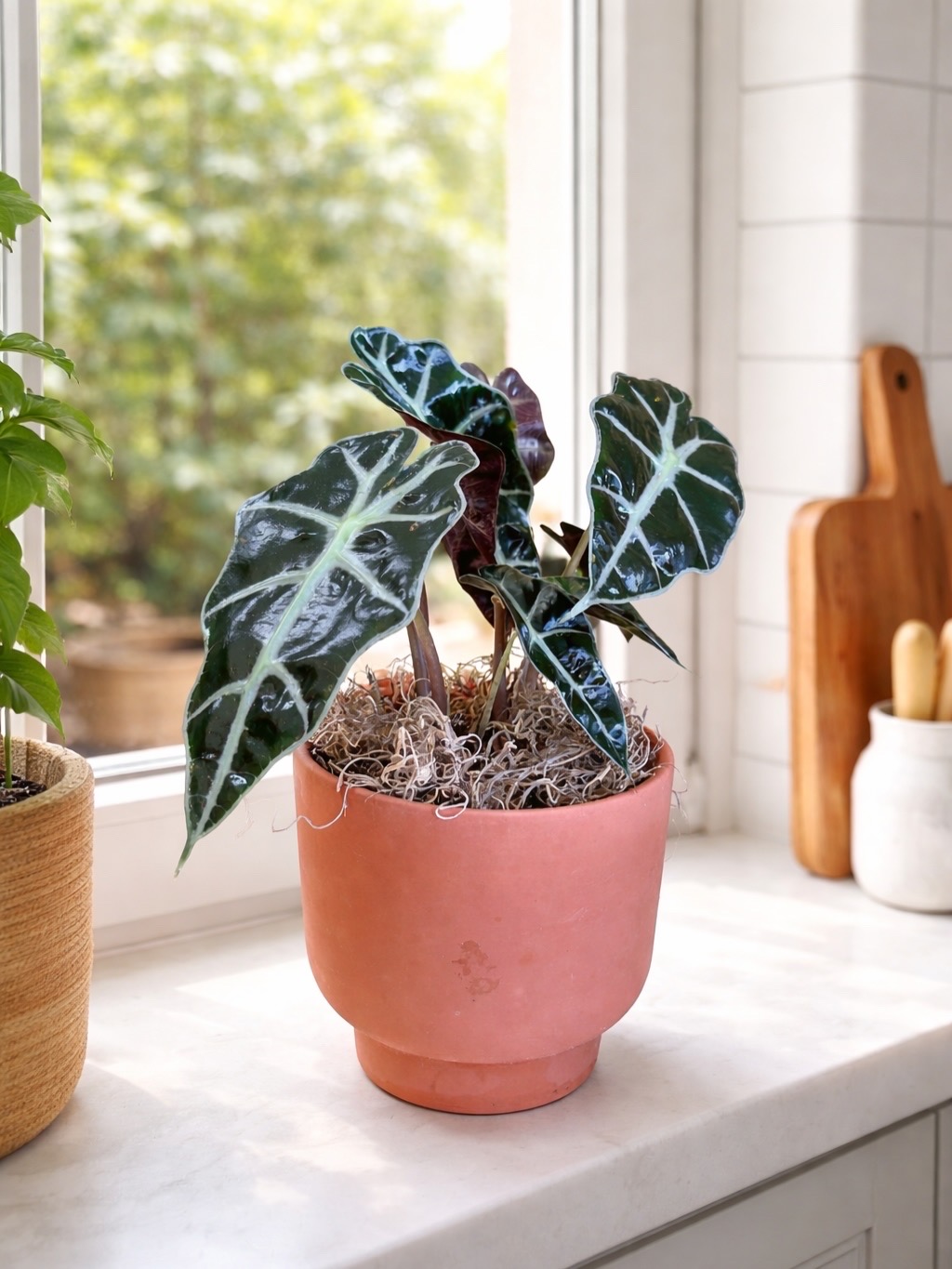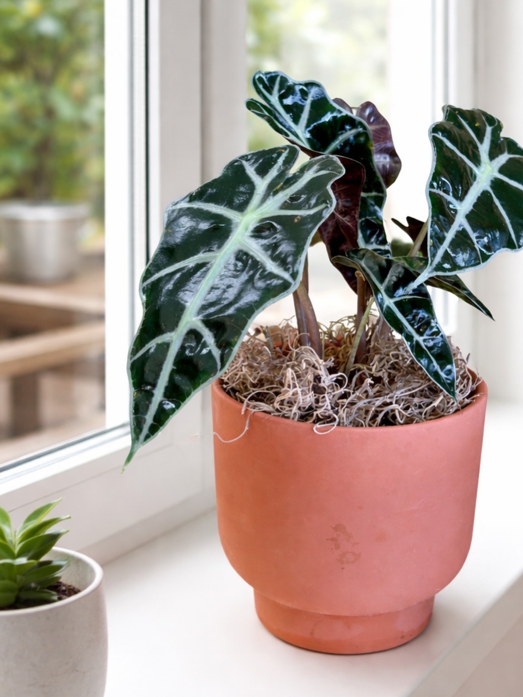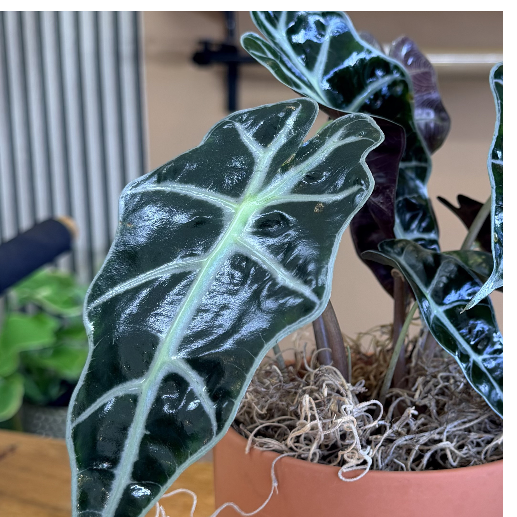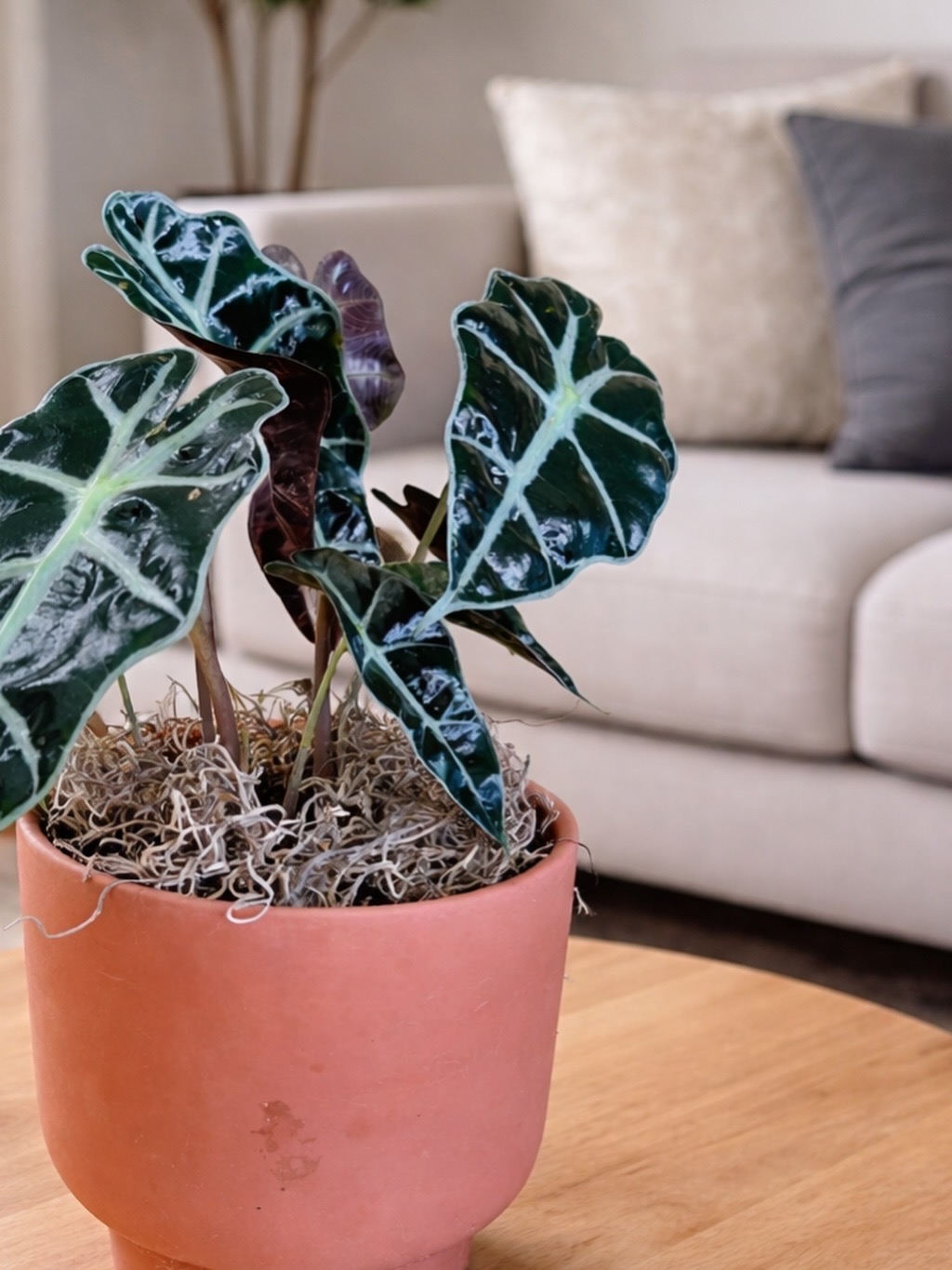 Thriving in bright, indirect light with moderate watering, the Alocasia is ideal for adding texture, depth, and a fresh, refined feel to your home or workspace.